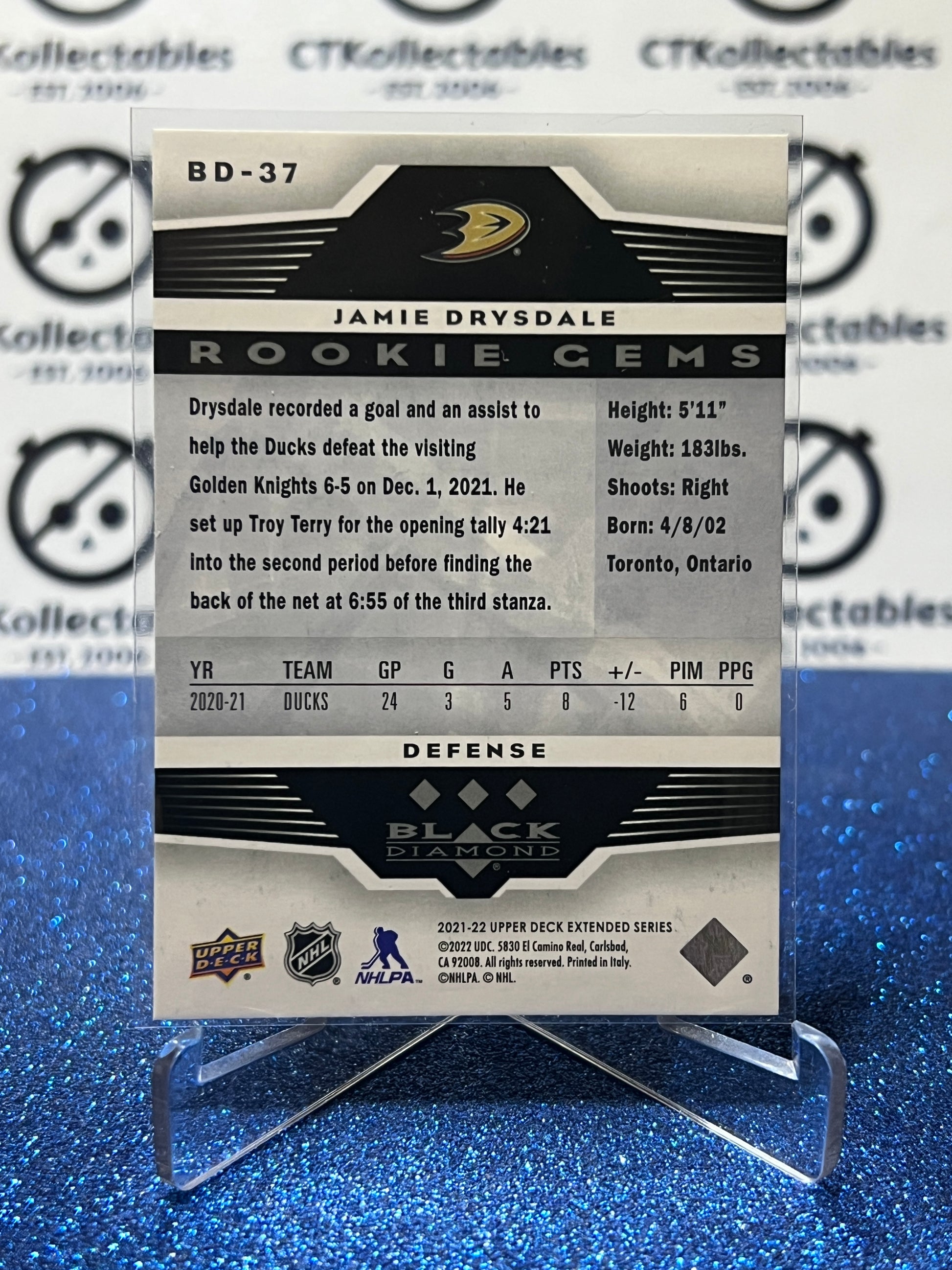 2021-22 UPPER DECK JAMIE DRYSDALE # BD-37 RC BLACK DIAMOND ANAHEIM DUCKS HOCKEY CARD