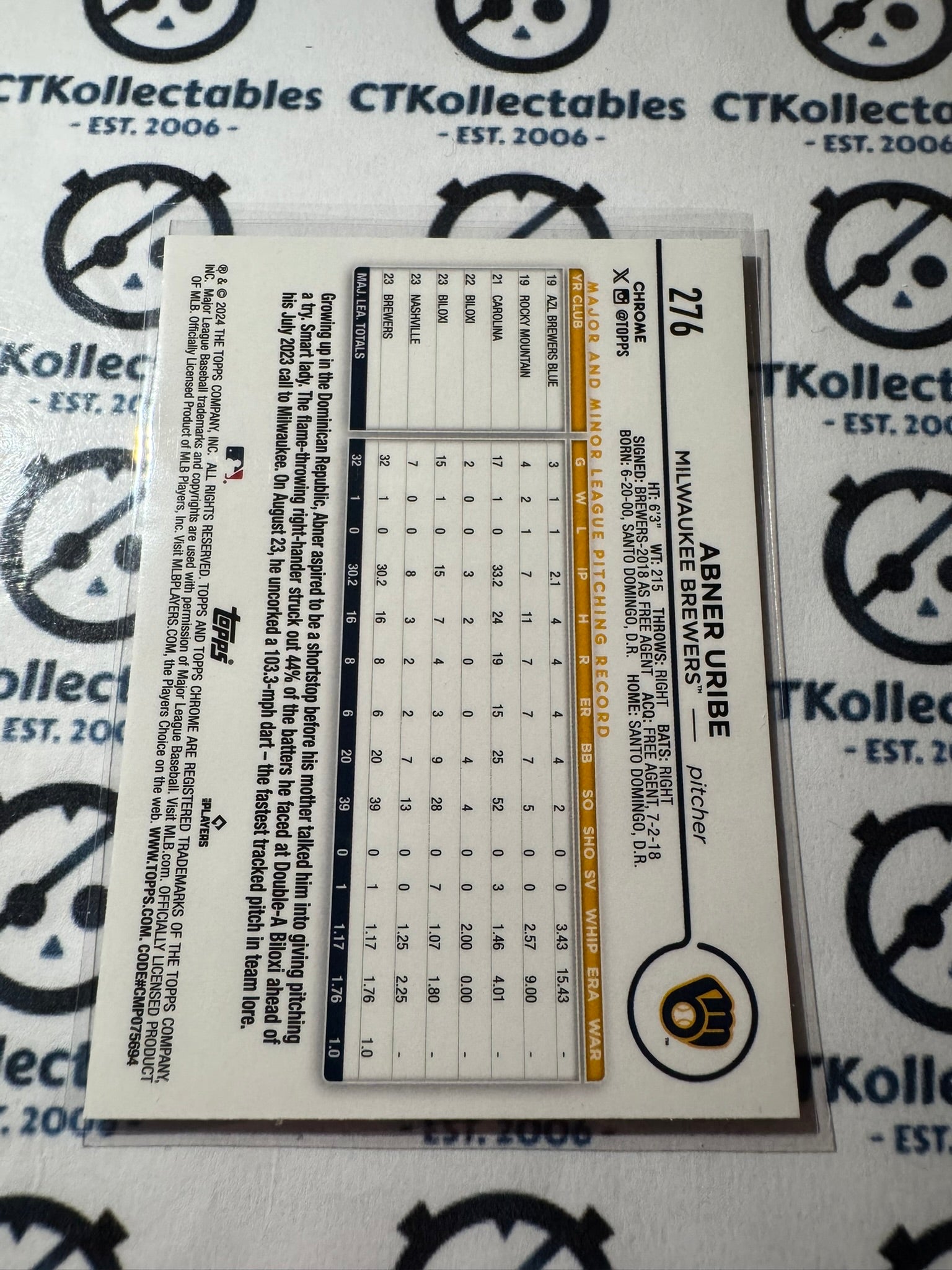 2024 Topps Chrome Baseball Abner Uribe rookie card RC #276 Brewers