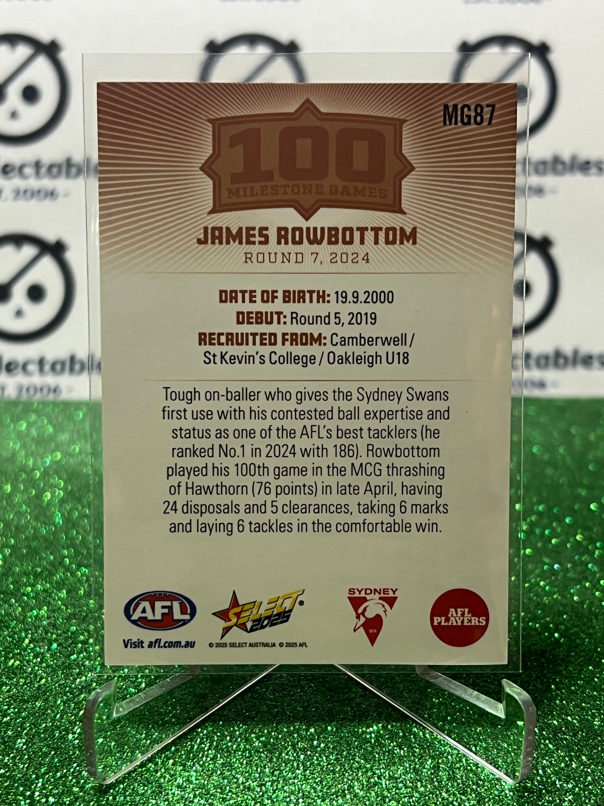 2025 AFL SELECT FOOTY STARS JAMES ROWBOTTOM # MG87 MILESTONE SYDNEY SWANS CARD